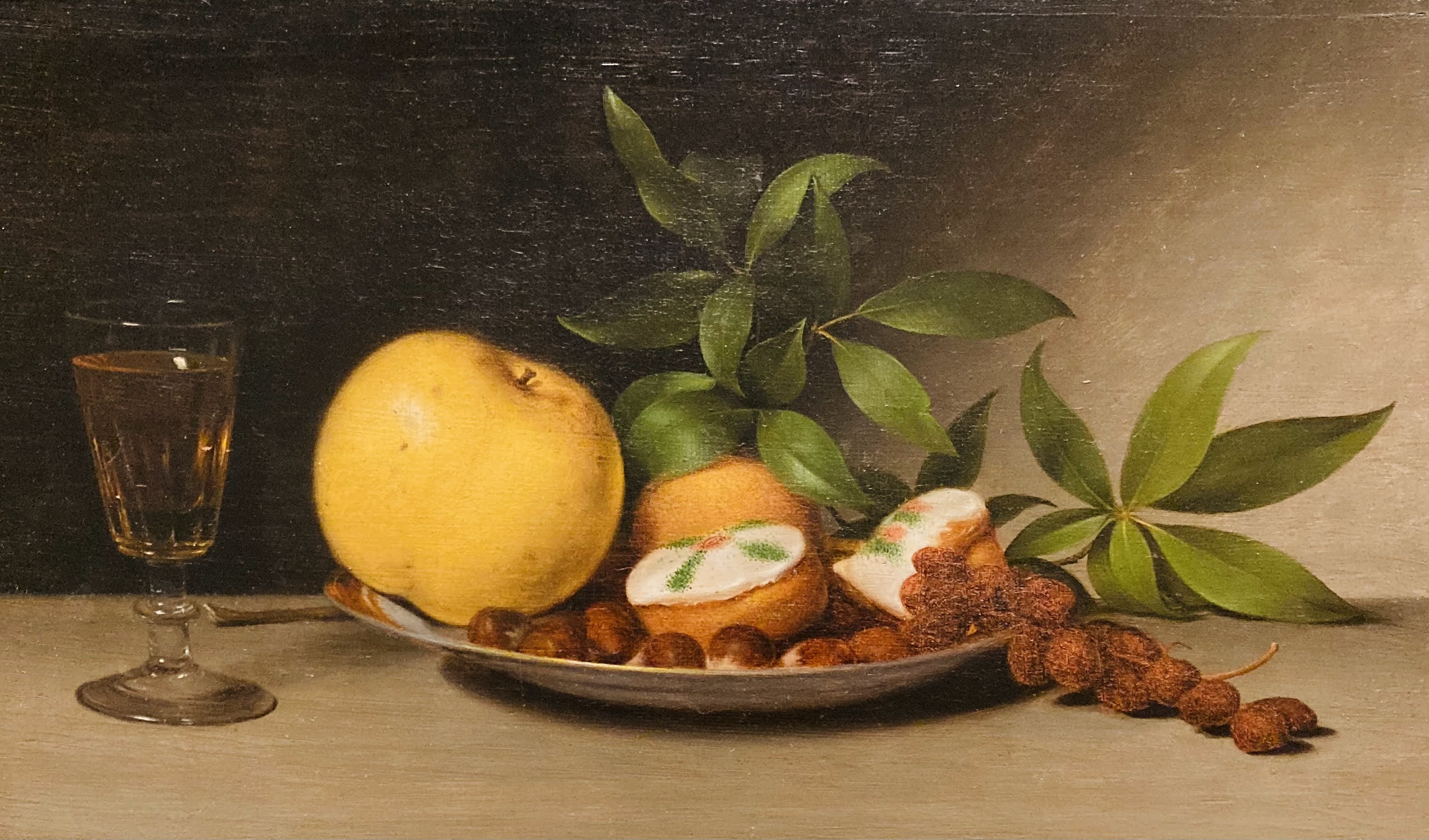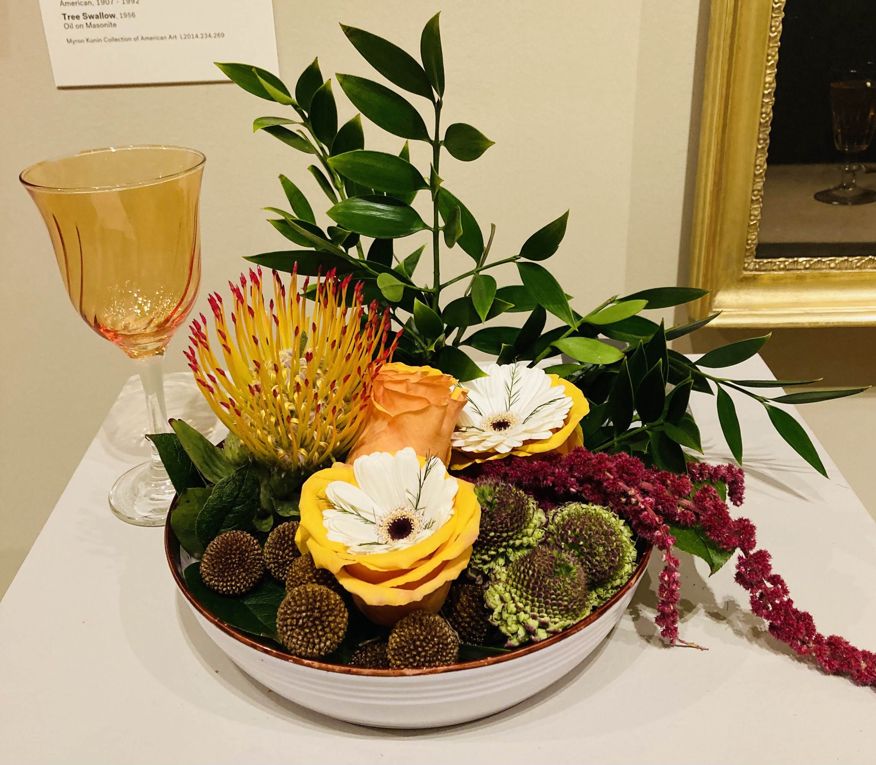 It’s hard to beat a good still life, or a flower arrangement to go with it. Myra Rustin from Flowers by Myra designed this arrangement to go with Raphaele Peale’s Still Life with Fruit, Cakes and Wine.