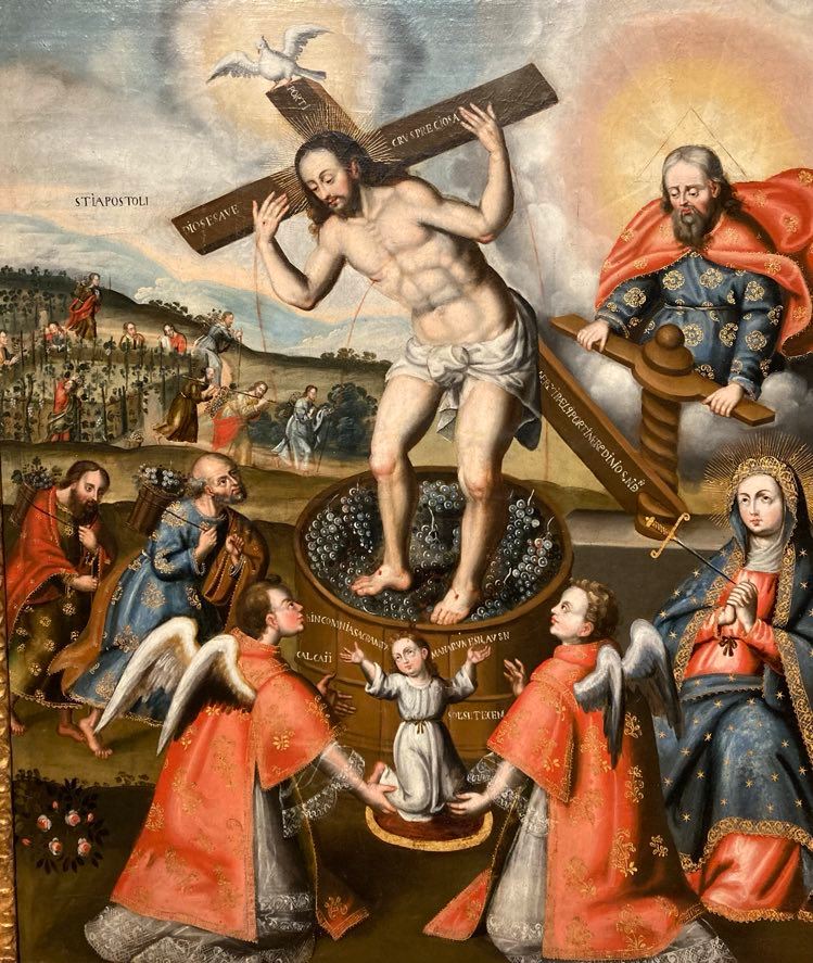 The grapes are being carried to the winepress by the sinful people and Jesus’ mother Mary sits below the winepress with a sword piercing her heart (Luke 2:34-35).